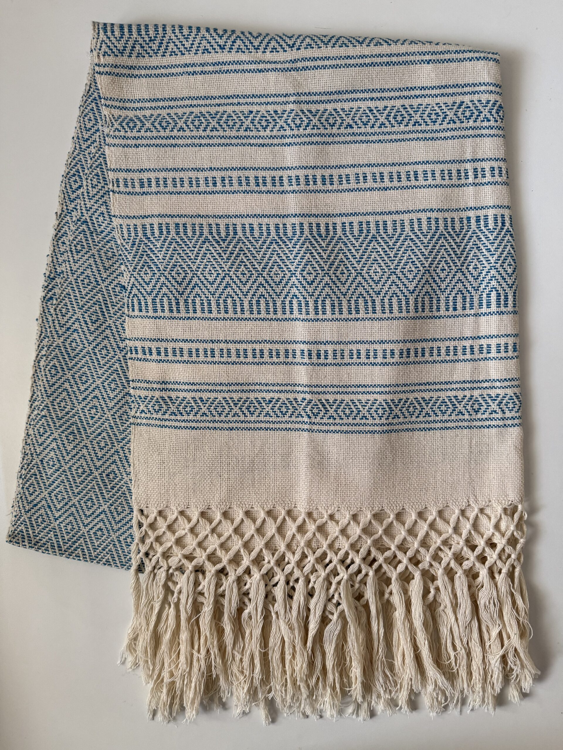 Ich matką jest jasna osnowa – i stąd jasne frędzle. Wzór jest tkany nicią w jednym kolorze, łagodnie widoczny.