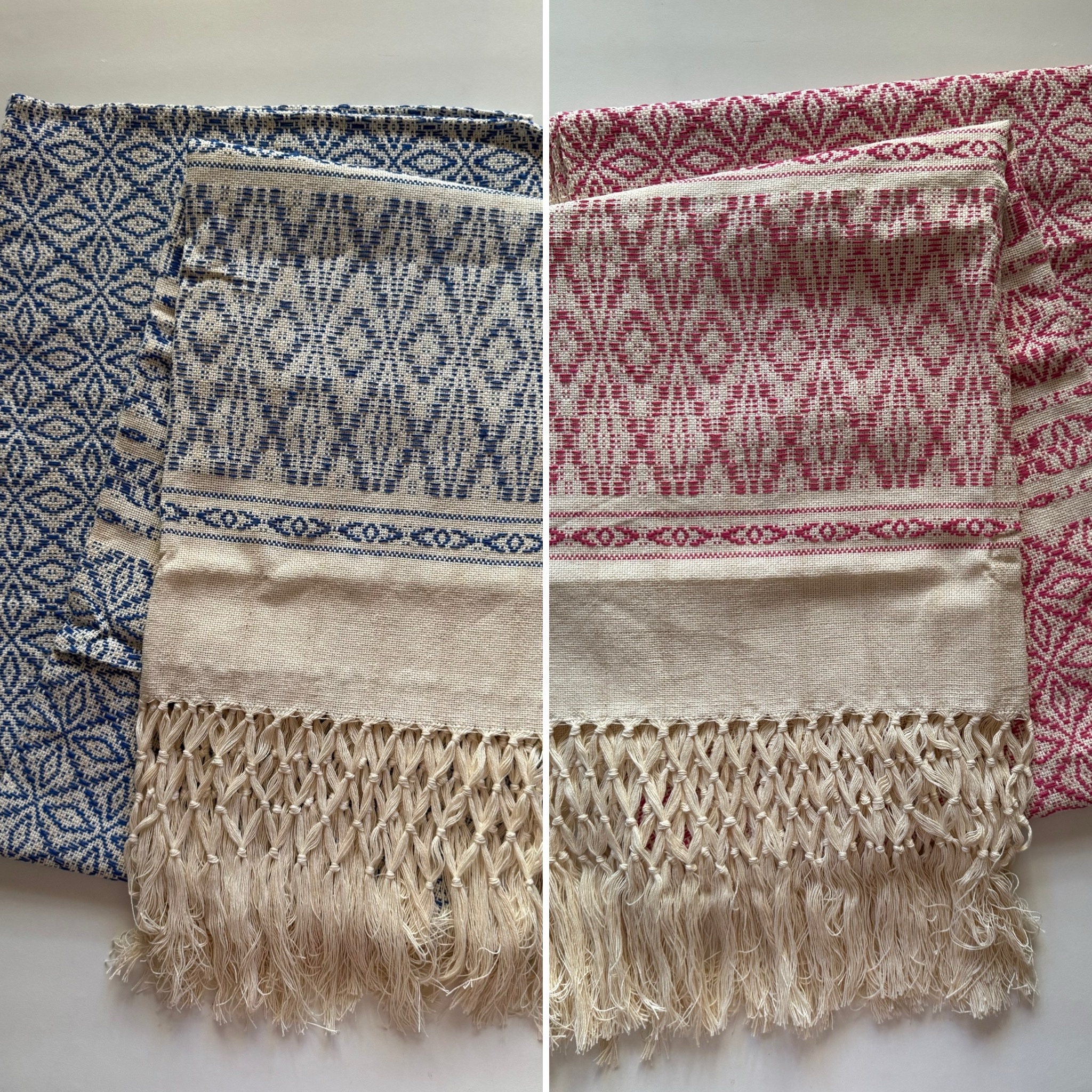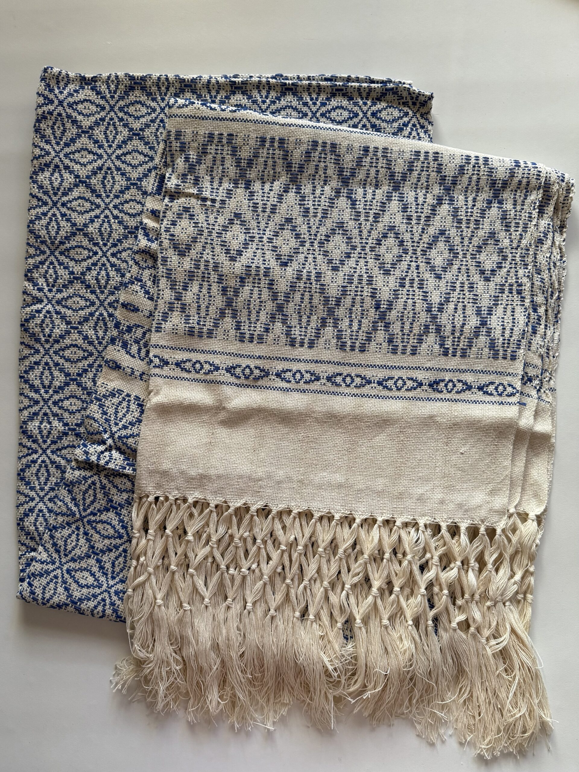 Długość ok. 270 cm plus frędzle, szczególnie szerokie – ok. 76 cm. Ręcznie tkany, ze 100% bawełny, kolorowe nici naturalnie barwione. Jasne frędzle z osnowy pięknie przeplatane nitką ze wzorem kwiatu passiflora. Pracowity wzór.